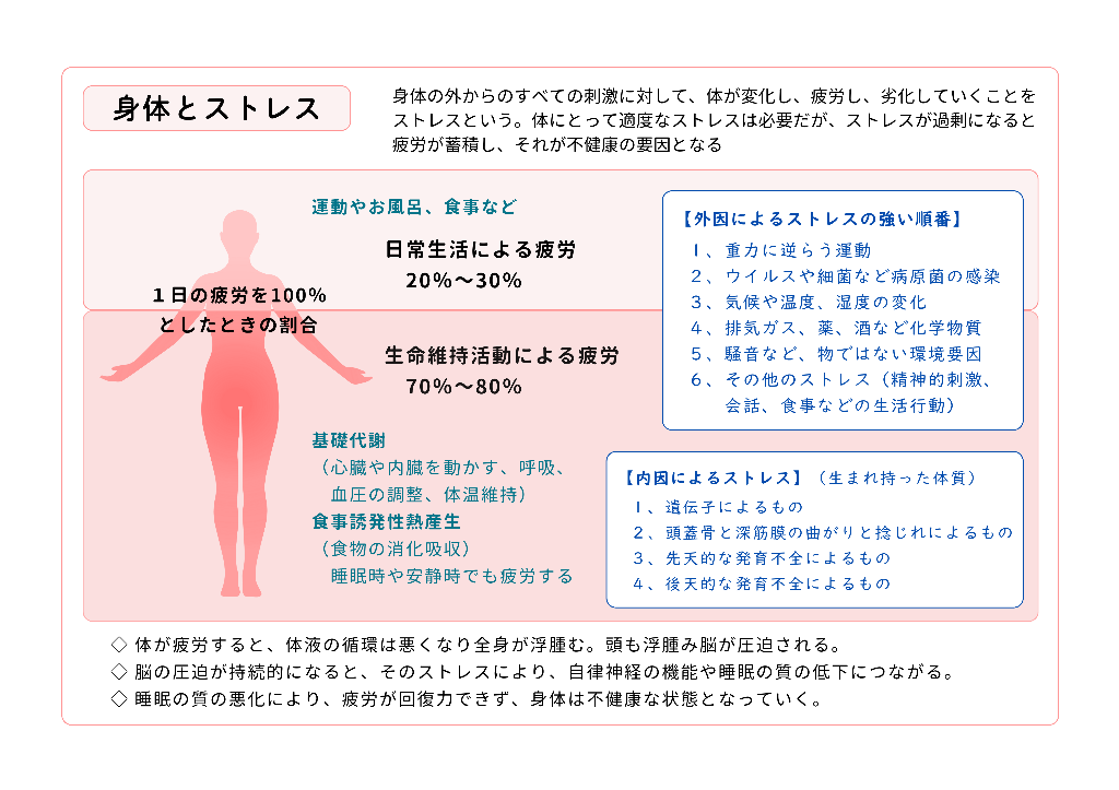 近年の気候の激変やウイルスなどの問題と、日常生活による身体的な疲労の蓄積や睡眠不足にともない、脳の圧迫ストレスが強くなることで生命力が低下して、身体は不健康な状態になっていくのです。